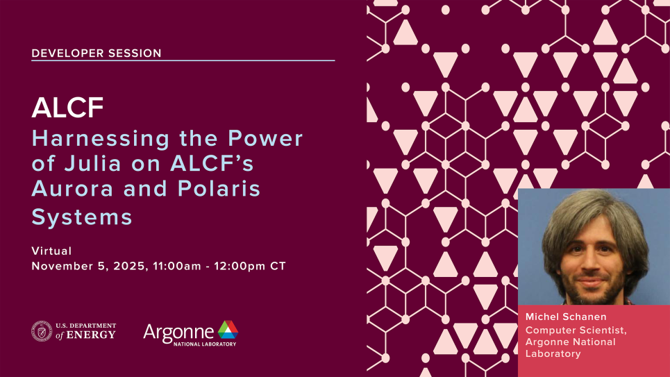 Join us on November 5, 2025, for a webinar on leveraging the Julia programming language on ALCF's leadership-class systems, Polaris and Aurora. Argonne's Michel Schanen will present the current status and best practices for using Julia to accelerate scientific discovery on next-generation hardware.