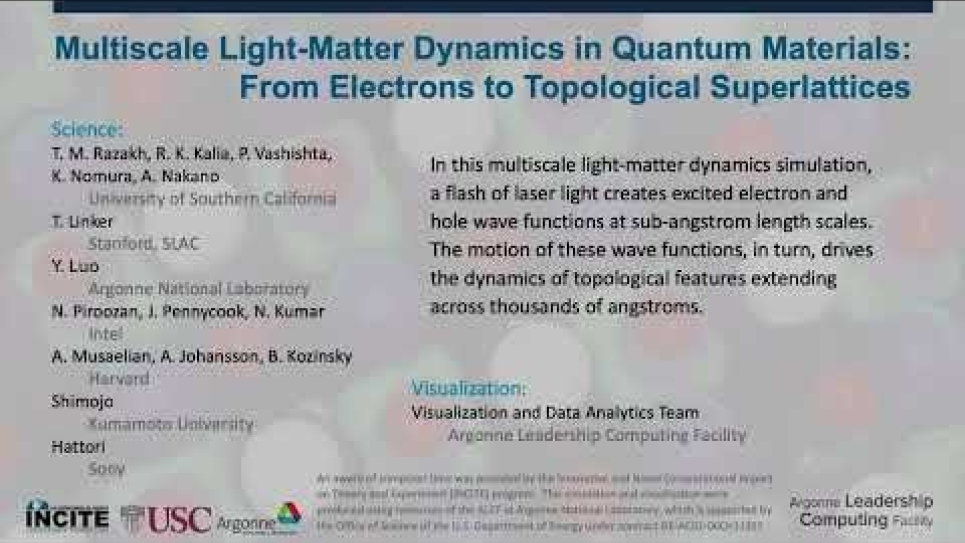The team’s study, “Multiscale light-matter dynamics in quantum materials: from electrons to topological superlattices,” was authored by Taufeq Mohammed Razakh, Rajiv Kalia, Priya Vashishta, Ken-ichi Nomura, and Aiichiro Nakano from USC; Thomas Linker from DOE’s SLAC National Accelerator Laboratory; Ye Luo from Argonne; Nariman Piroozan, John Pennycook, and Nalini Kumar from Intel; Albert Musaelian, Anders Johansson and Boris Kozinsky from Harvard; Fuyuki Shimojo from Kumamoto University; and Shinnosuke Hattori from Sony Group Corporation.
