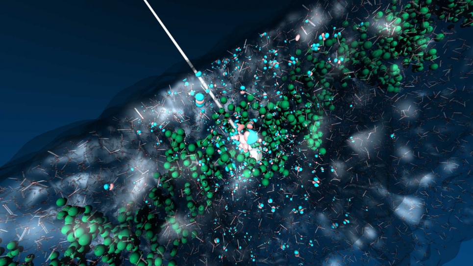 An INCITE project led by the University of North Carolina at Chapel Hill is using Argonne’s Theta supercomputer to advance our understanding of electronic stopping processes. This image is a snapshot from a non-equilibrium electron dynamics simulation of solvated DNA under proton irradiation. Image: Dillon C. Yost, University of North Carolina at Chapel Hill