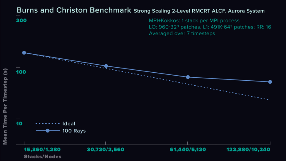 To scale application codes to hundreds and thousands of Aurora processes via the AMT framework, the development team focused on a Reverse Monte-Carlo Ray Tracing radiation benchmark calculation, central to the University of Utah’s predictive boiler simulations. This benchmark involves potentially global all-to-all communication and uses adaptive mesh refinement and ray tracing to achieve scalability. This benchmark has been used as part of previous scalability studies on a number of pre-exascale systems and the DOE-operated exascale Frontier system while harnessing 98 percent of the machine.