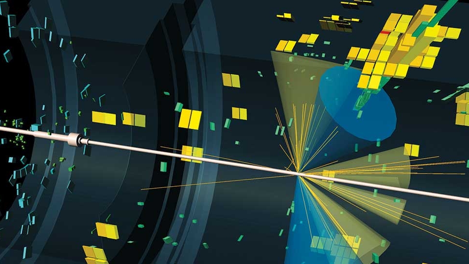 A candidate event in which a Higgs boson is produced in conjunction with top and anti-top quarks which decay to jets of particles. Image: CERN