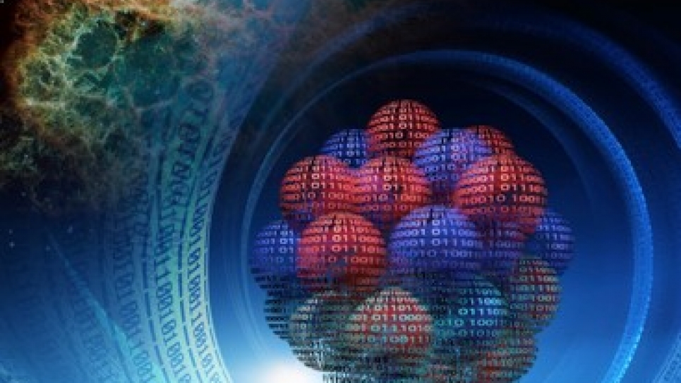 Conceptual art connects the atomic underpinnings of the neutron-rich calcium-48 nucleus with the Crab Nebula, which has a neutron star at its heart. Zeros and ones depict the computational power needed to explore objects that differ in size by 18 orders of magnitude. Image: Gaute Hagen, Oak Ridge National Laboratory