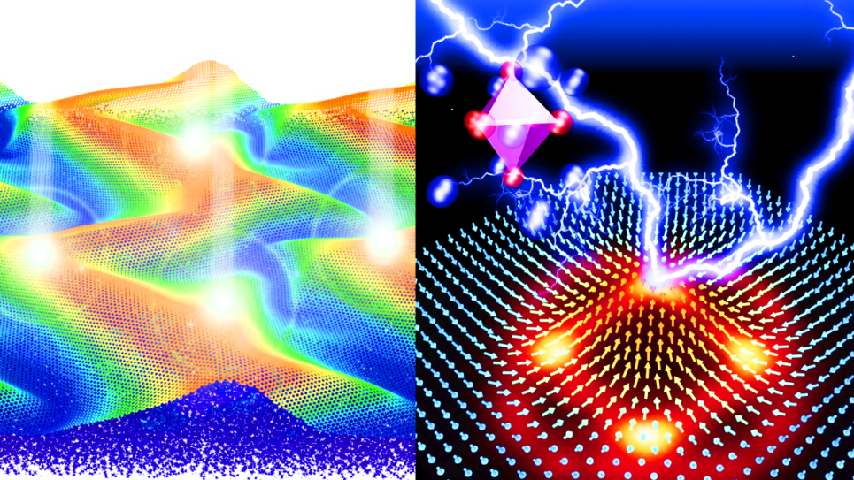 (Left) Self-assembled quantum emitter array in atomically thin metastructures. (Right) Topological switching in ferroelectrics. Image: Thomas Linker, Anikeya Aditya, and Ken-ichi Nomura, University of Southern California.