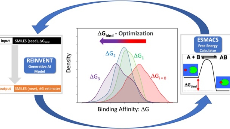 The IMPECCABLE workflow integrates machine learning (ML) and physics-based (PB) methods to accelerate drug discovery. By incorporating multiple ML and PB approaches, it leverages their strengths while mitigating individual limitations. The workflow is being scaled on exascale machines to efficiently identify potential drug candidates for various target proteins. Image: Peter V. Coveney, University College London