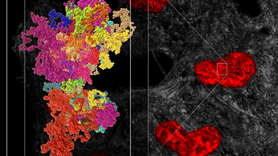 Polymer model representing chromatin organization of a single chromosome overlaid upon a cell image measured by the spectroscopic microscopy imaging technique PWS. Image: Aya Eid, Adam Eshein, and Anne Shim,Northwestern University
