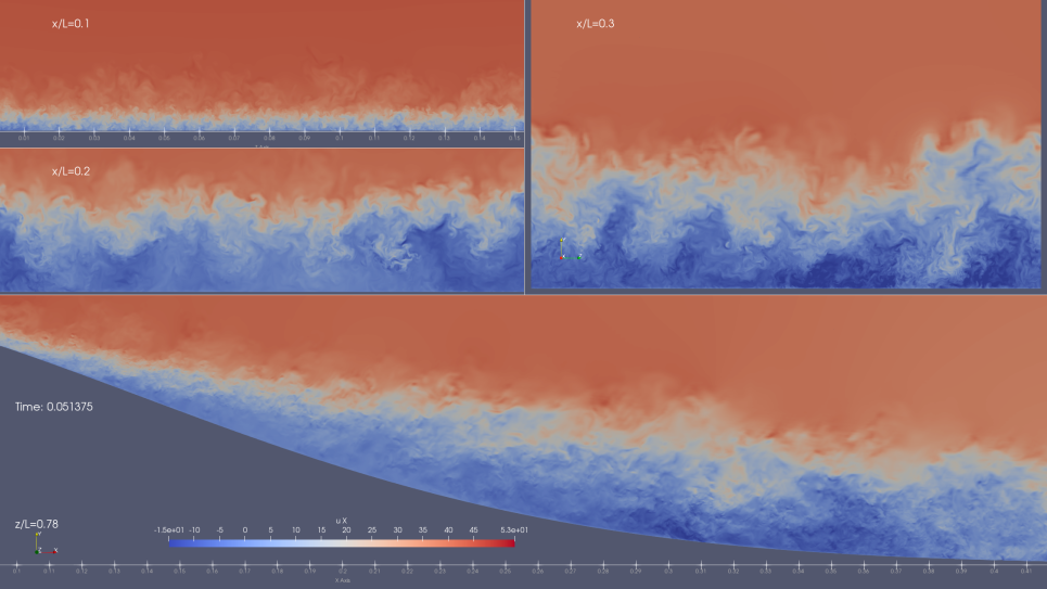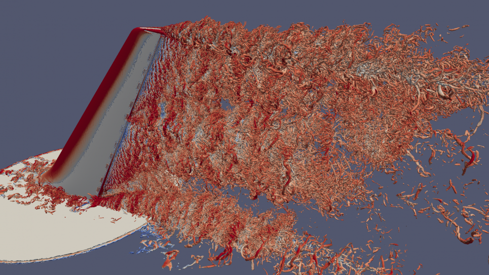 Flow over a vertical tail/rudder assembly (grey surface) with 24 active synthetic jets which introduce vortical structures (visualized by isosurfaces of vorticity colored by local flow speed) that alter the flow, reducing separation, improving rudder performance, and thereby allowing future aircraft designs to lower drag and fuel consumption. Image: Jun Fang, Argonne National Laboratory