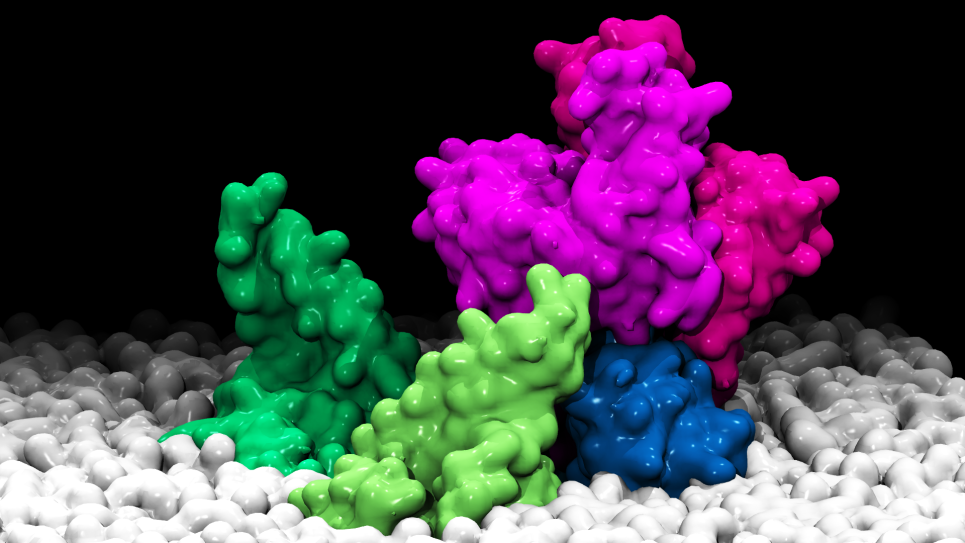 An artificially designed symmetric peptide macrocycle which binds a metal ion at its center, and which acts as a metal-triggered conformational switch. Unlike natural proteins, which are built from amino acids that all have the same handedness, artificial peptides may be synthesized from building blocks that are mirror images of natural amino acids. In this image, the lobes of the molecule that are colored red are the mirror images of the lobes of the molecule that are colored blue. (Image: Vikram Mulligan, Flatiron Institute)