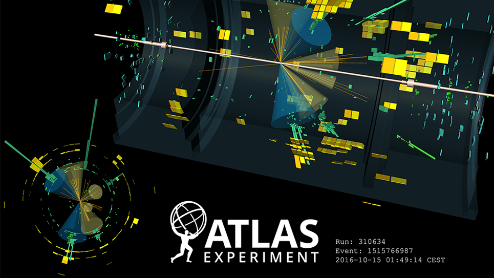 A candidate event in which a Higgs boson is produced in conjunction with top and anti-top quarks which decay to jets of particles. The challenge is to identify and reconstruct this type of event in the presence of background processes with similar signatures which are thousands of times more likely. (Image: CERN)