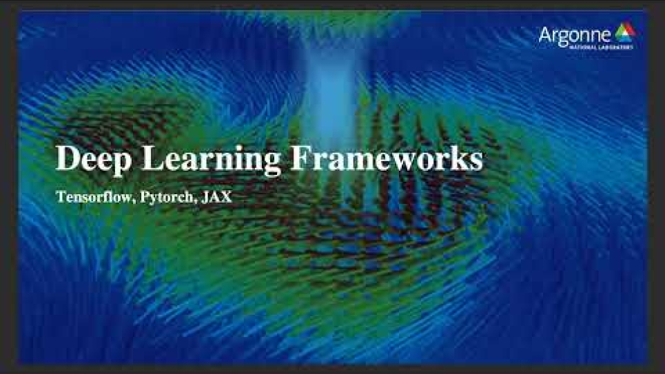 This session gives an overview of using Tensorflow, Pytorch, and JAX are the core deep learning frameworks on ALCF production resources. All three frameworks are accessible in python (and a few other languages, for tf/torch) and offer the core elements of: