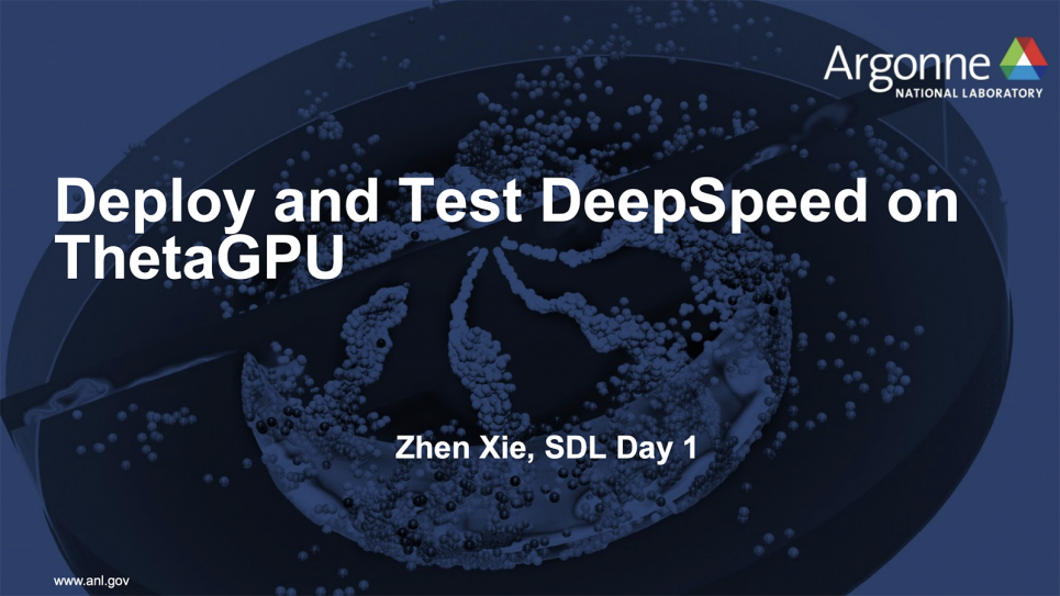 ZhenXie-SDL-Day1-slides-DeepSpeed.pdf pdf (1.37 MB) Download Zhen Xie discusses deploying and testing DeepSpeed on ThetaGPU. Presenter Zhen Xie, Argonne National Lab