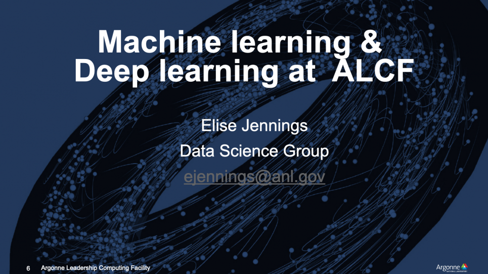 Jennings_ML_ADSP_SDL_OCT_2018.pdf pdf (10.12 MB) Download Presenter Elise Jennings, ALCF Related Event ALCF Simulation, Data, and Learning Workshop | Fall 2018
